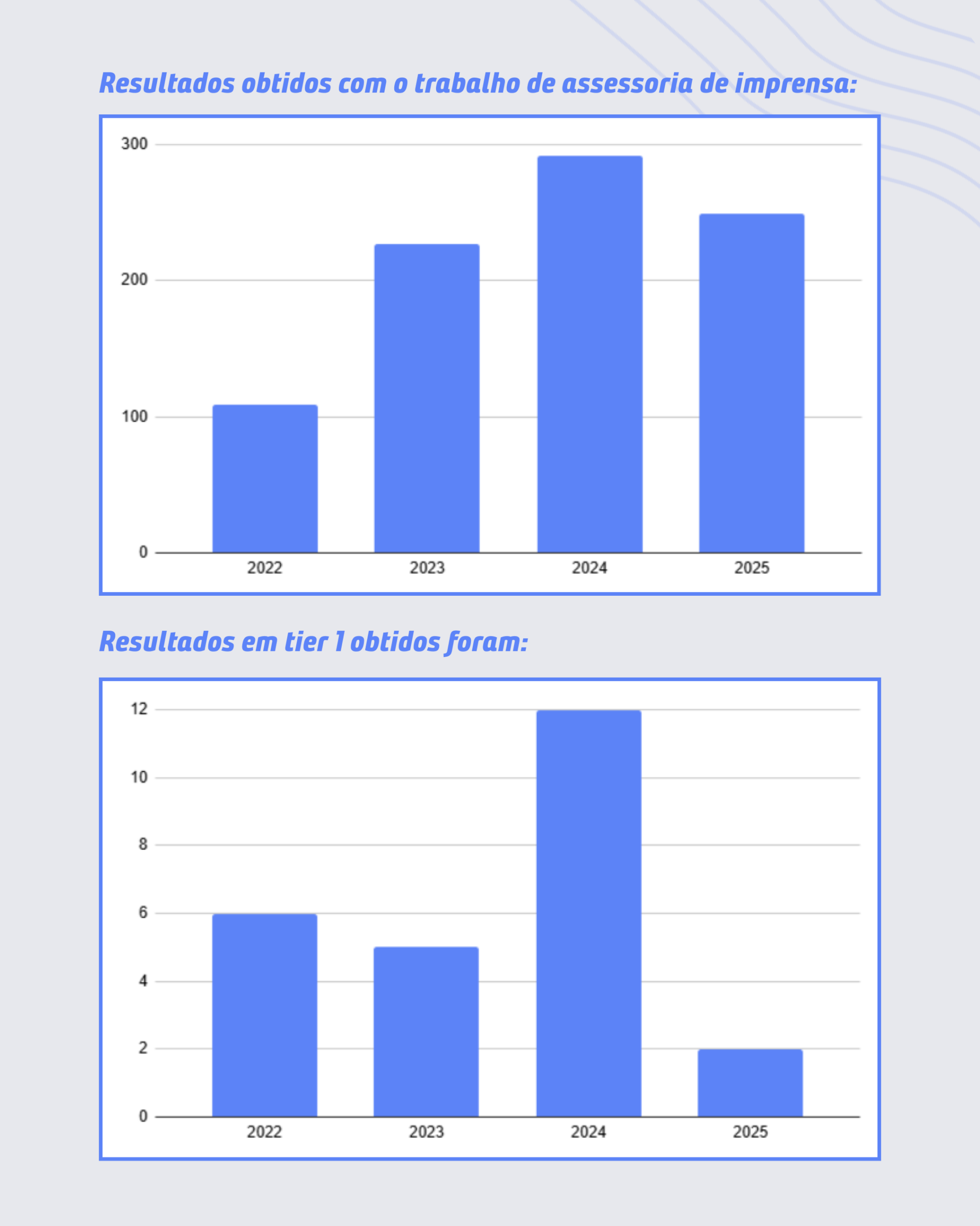 No segmento tier 1, os destaques são as emplacadas em portais como Valor Econômico, Terra, InfoMoney, Correio Braziliense, Valor Investe, Folha de S.Paulo, Forbes e CartaCapital. De 2022 até julho de 2025, os resultados em tier 1 obtidos com o trabalho de assessoria de imprensa foram: